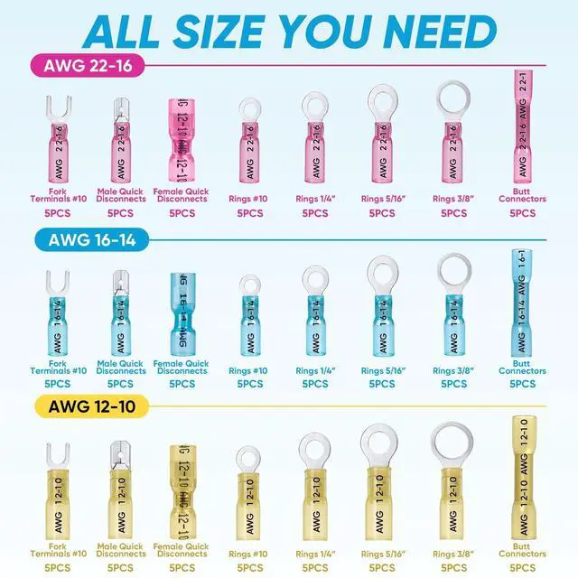 ![]() Heat Shrink Connector Kit | ![]() Solder Seal Connectors | ![]() Spade Quick Connectors | ![]() T Tap Wire Connectors | ![]() Heat Shrink Connector Kit | ![]() Heat Shrink Connector Kit |
