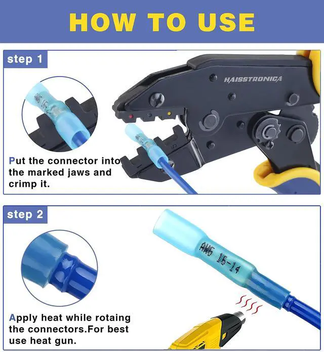 - This haisstronica crimping tool designed for heat shrink connectors,crimp does not destroy the heat shrink tube, color coded for ease of use.
