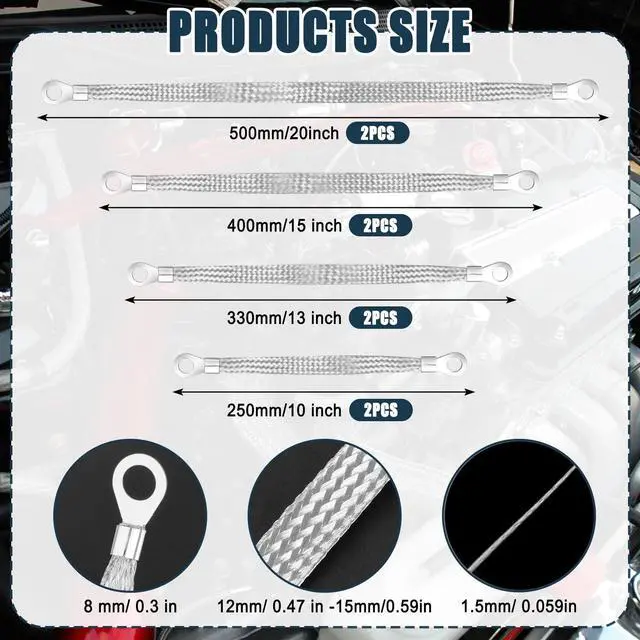 Ground StrapsThere are 8 thicken car ground straps, 4 different sizes, 2 of each size. 2x10 inch(250mm), 2x13 inch(330mm), 2x15 inch(400mm), 2x20 inch(500mm). Different sizes can meet your different needs.