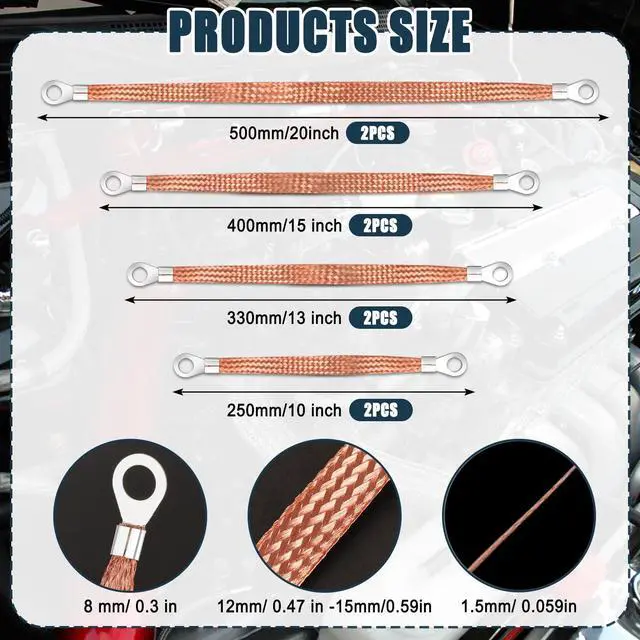 Ground StrapsThere are 8 thicken car ground straps, 4 different sizes, 2 of each size. 2x10 inch(250mm), 2x13 inch(330mm), 2x15 inch(400mm), 2x20 inch(500mm). Different sizes can meet your different needs.