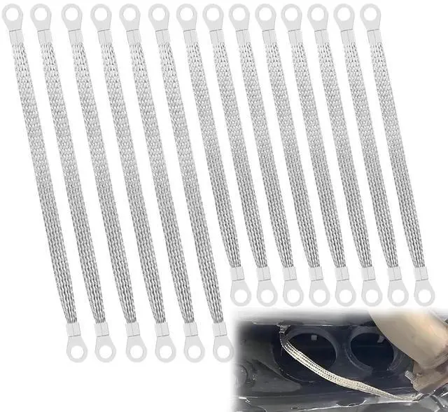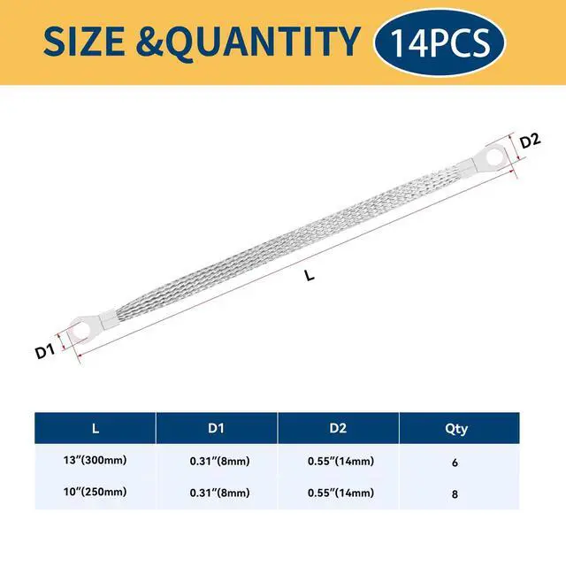 14 Pcs Ground Strap Kit, Includes 8 pcs 10" and 6 pcs 12" braided copper ground straps with pre-attached ring terminals. Ideal for use as engine ground strap, battery ground strap, grounding straps, or LS swap parts in automotive electrical systems.