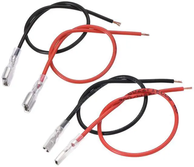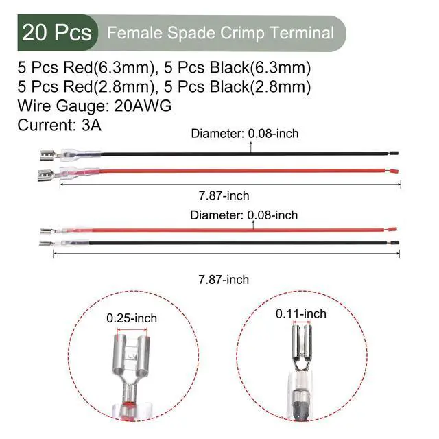 WHAT YOU GET - The package comes with 20pcs (5pcs 2.8mm and 5pcs 6.3mm in red, 5pcs 2.8mm and 5pcs 6.3mm in black) female spade crimp terminal that wire length is 20-cm / 7.87-inch, connector inner diameter is 2.8-mm / 0.11-inch (6.3-mm / 0.25-inch) and wire gauge is 0.5-mm² / 20AWG.