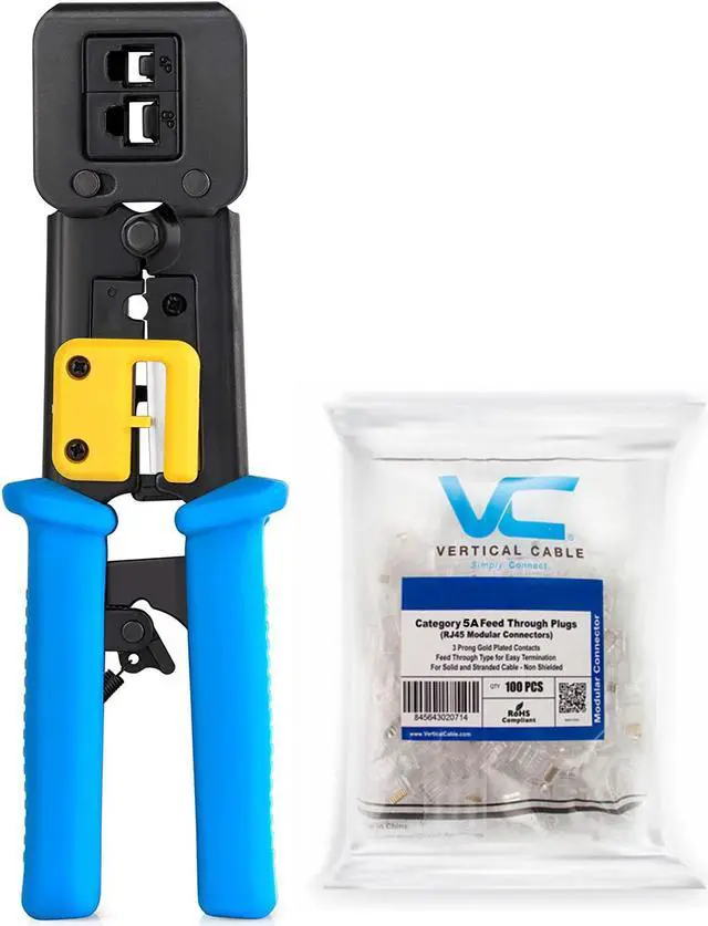 The Vertical Cable all in one Professional RJ45 termination tool cuts, strips and crimps CAT3, CAT5e and CAT6/6A cable using RJ11/RJ12 standard and RJ45 Pass-Thru connectors.