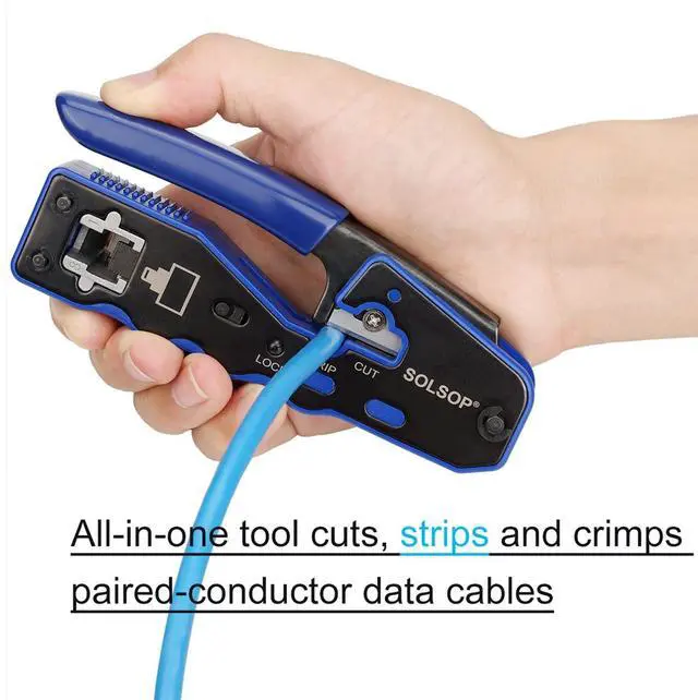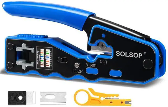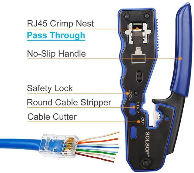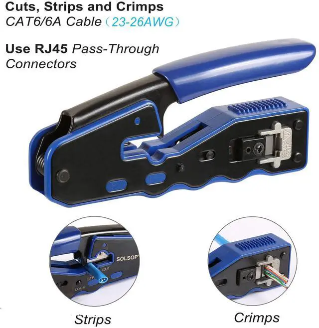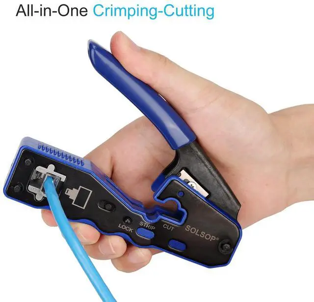Solsop Pass-Through CAT6 Crimping Tool RJ45, All in One Tool Cuts, Strips, Crimps, Fast and Reliable
