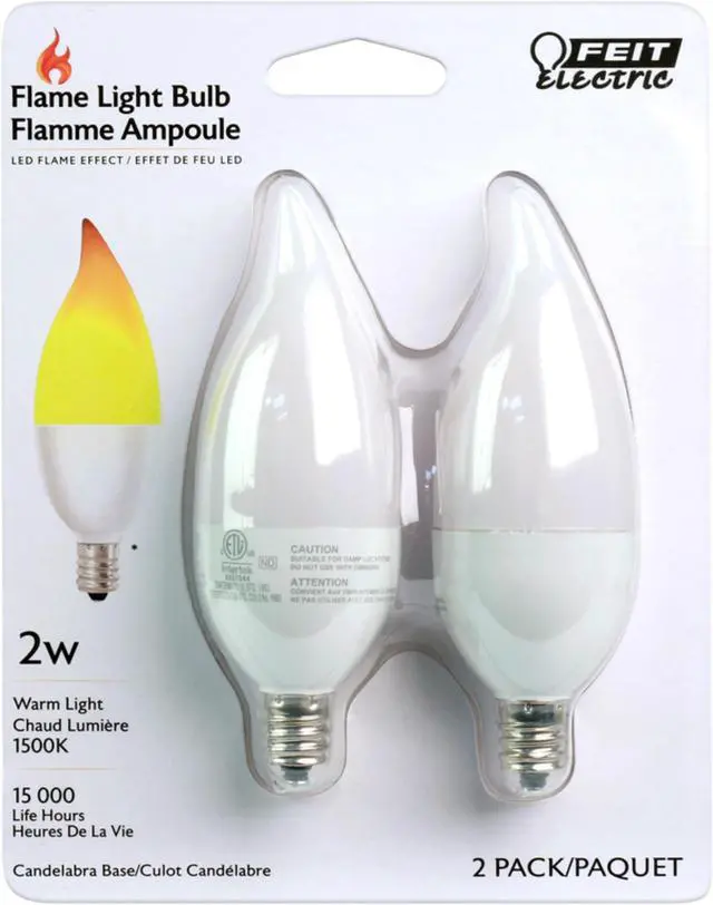 Enjoy all the benefits of advanced LED energy-saving technology with the Feit Electric BPFLAME/C/LED/2 Light Bulbs. The live flame effect glows bright instantly, just screw it into a light socket. Add a beautiful flame effect that livens up parties, homes, bars, and restaurants. This non-dimmable bulb uses 2 watts of electricity with an average life of 15,000 hours / 13.7 years, which makes energy efficient and environmentally friendly without compromising performance or fun. Celebrate throughout the day and night and experience considerable energy savings in comparison to traditional incandescent bulbs.