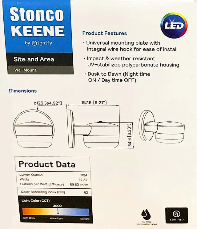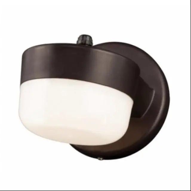This compact luminaire easily mounts over a standard 4" j-box and features a built-in button photo cell for automatic dusk to dawn lighting needs.