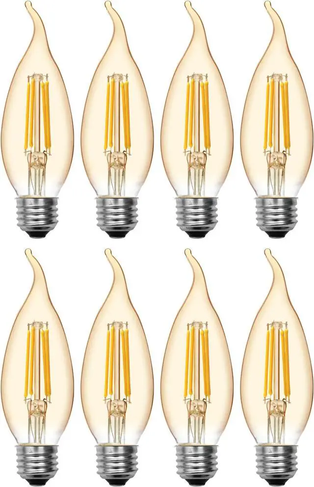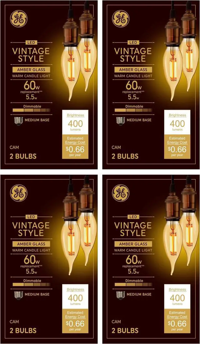 GE's Vintage Style LED 60-Watt Replacement Amber Decorative flame bent tip light bulb combines the retro look of antique straight filament incandescent bulbs with the benefits of LED. A dimmable warm, candlelight glow and golden- tinted glass recreate the vintage style light bulb. Thanks to its aesthetic design, the light bulb compliments your fixture and adds a decorative touch even when the light is off. The long life and low energy use of GE LED Vintage Style bulbs will help you save money on energy. Use this medium-base GE LED decorative bulb in indoor chandeliers, sconces, and fixtures where the bulb is visible.