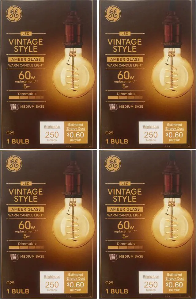 - Add KEY_TAB a charming rustic vibe to your space with this dimmable GE LED Vintage KEY_TAB Amber Light Bulb. It combines the retro look of antique incandescent KEY_TAB bulbs with the benefits of LED. A dimmable warm, candlelit glow and KEY_TAB golden-tinted glass recreate an old world style. The long life and low KEY_TAB energy consumption of the G25 light bulb make it a cost-effective KEY_TAB choice. Use it on chandeliers, pendants and other types of decorative KEY_TAB fixtures. This pack contains one piece.