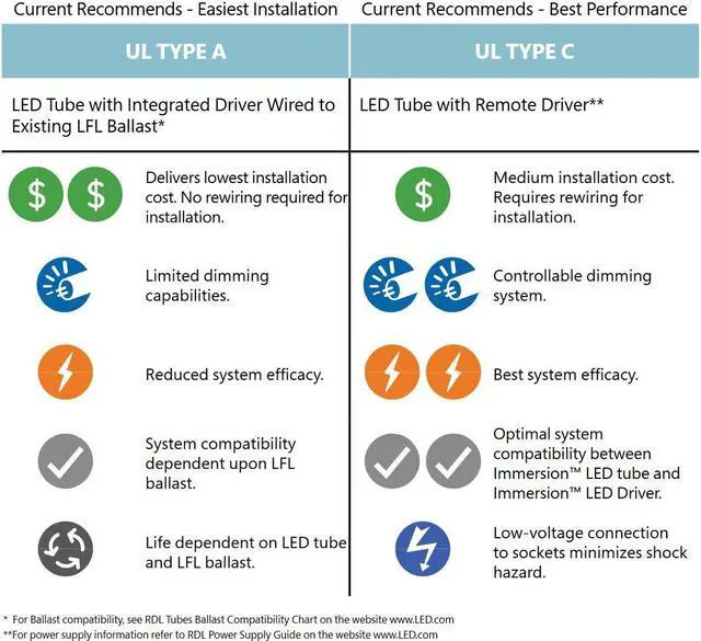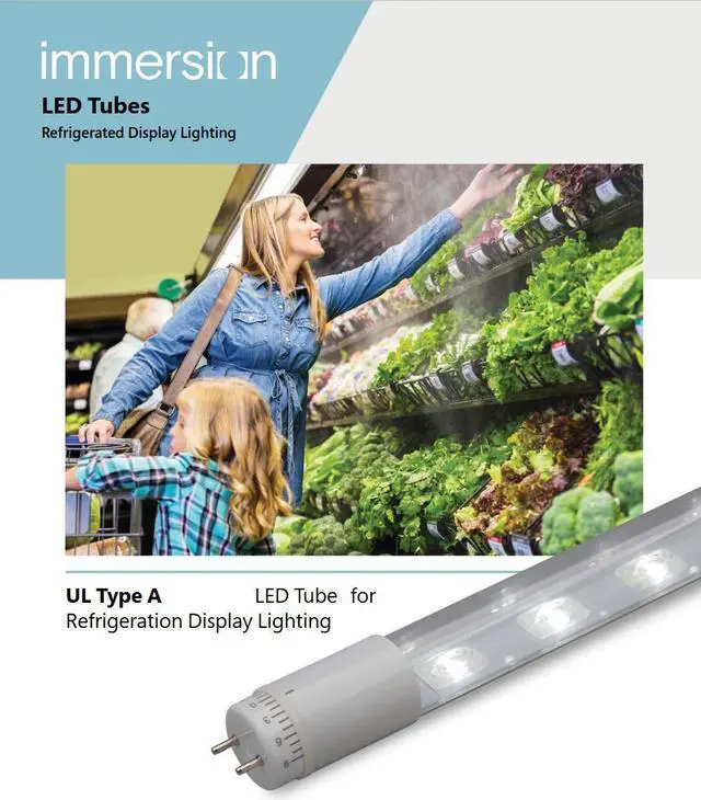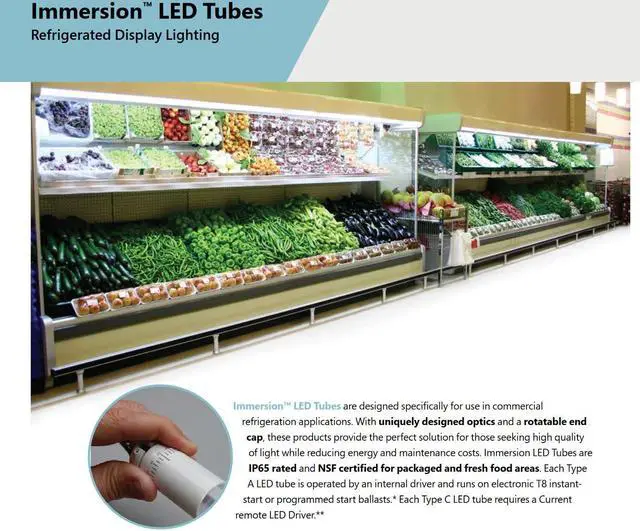 - Immersion LED tubes are designed specifically for use in commercial refrigeration applications. KEY_TAB With uniquely designed optics and a rotatable end cap, these products provide the perfect solution for those seeking high quality of light while reducing energy and maintenance costs. KEY_TAB Immersion LED Tubes are IP65 rated and NSF certified for packaged food areas. KEY_TAB Each Type A LED tube is operated by an internal driver and runs on electronic T8 instant start or programmed start ballasts.
