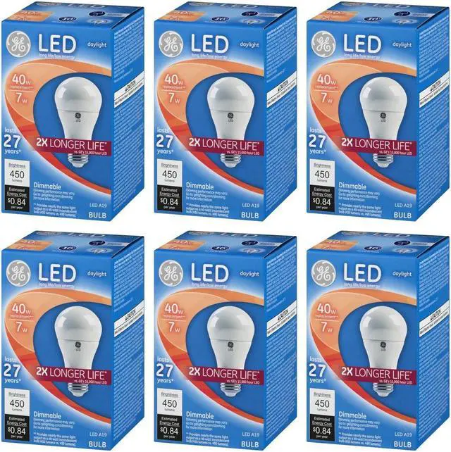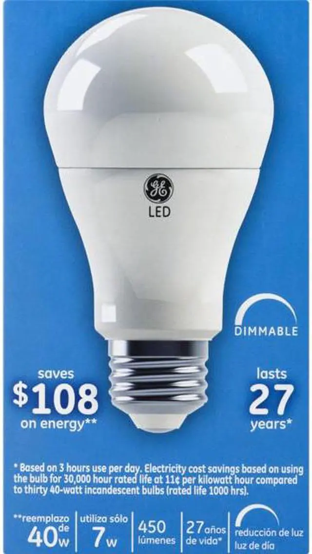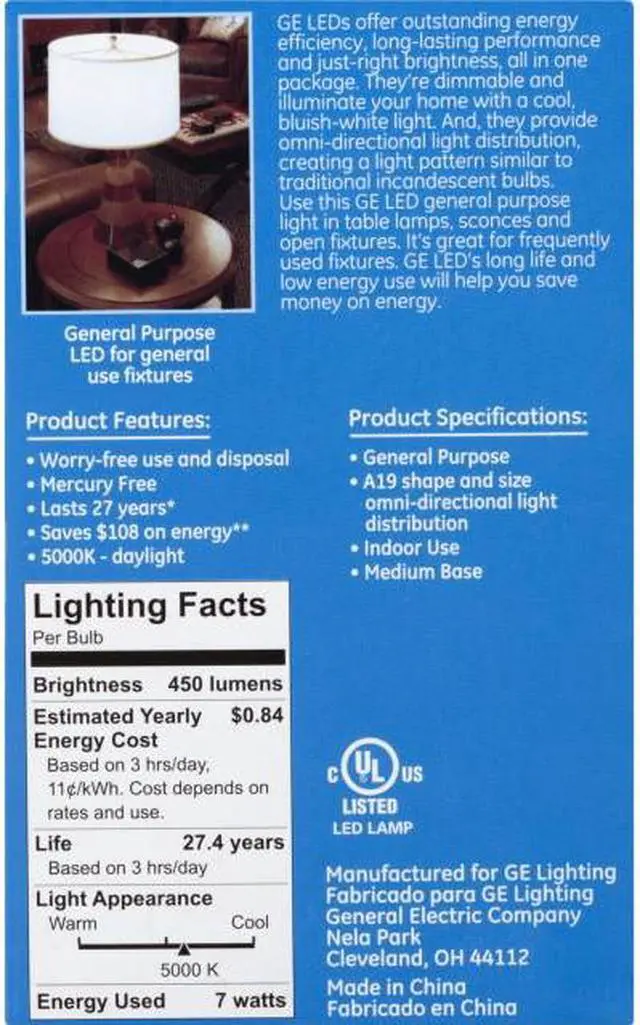 GE KEY_TAB Daylight LED light bulbs offer outstanding energy efficiency and KEY_TAB long-lasting performance. It offers cool, bluish-white light (5000K). Use GE LED KEY_TAB general purpose light in table lamps, sconces and open fixtures to KEY_TAB replace 40-watt incandescent bulbs. It?s great for frequently used KEY_TAB fixtures?GE LED?s long life and low energy use will help you save money KEY_TAB on energy.