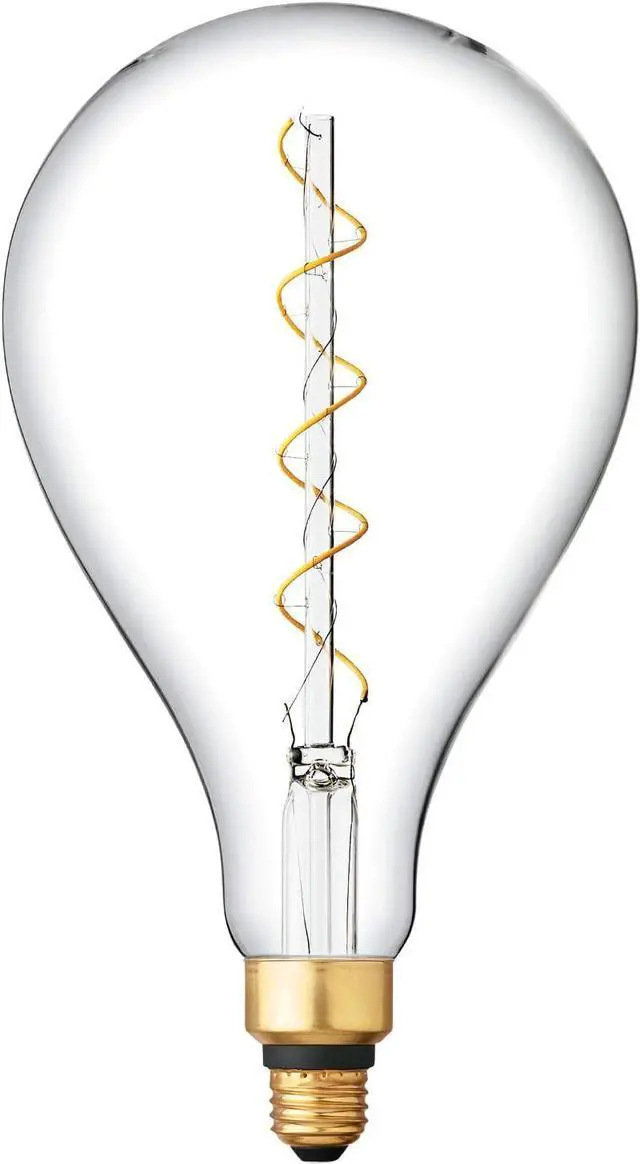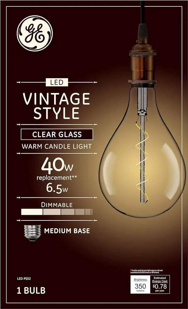 Large KEY_TAB Vintage Style Spiral Filament 40-Watt Replacement Clear Finish PS52 KEY_TAB Pear-Shaped LED light bulb creates a dramatic and impressive focal point in any room. KEY_TAB The sizeable glass globe and delicate spiral filament beautifully accent KEY_TAB traditional or modern fixtures. A warm candlelight glow that is KEY_TAB dimmable recreates the feel of Edison-style incandescent bulbs. This KEY_TAB decorative bulb is rated to last 13 years based on 3 hours per day use. KEY_TAB It features instant full brightness. Use the Large Vintage Style PS52 Pear-Shaped bulb with a KEY_TAB medium base in dimmable pendant lights, table lamps and floor lamps. KEY_TAB Remove the lamp shade and highlight the refined style of Large Vintage KEY_TAB Style LED bulbs.