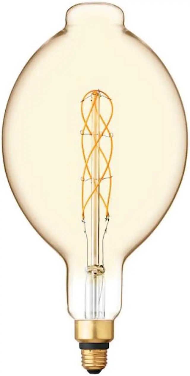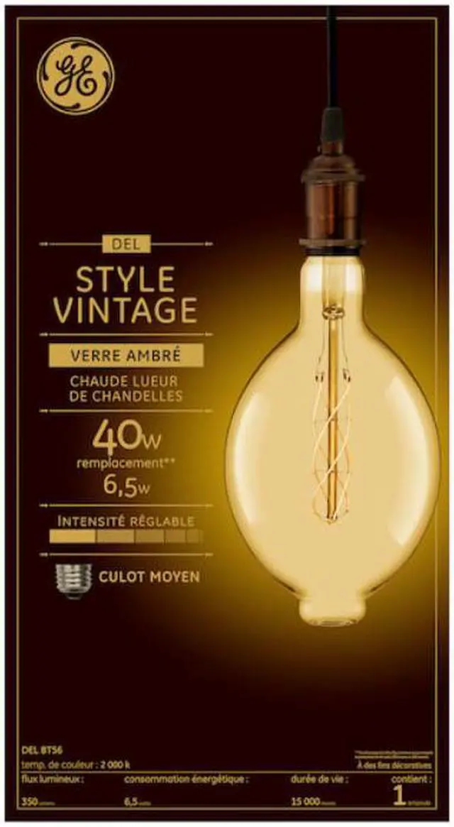 - 40-Watt Replacement Amber Finish BT56 Decorative LED light bulb creates a dramatic and uplifting focal point in KEY_TAB any room. The sizeable glass globe and delicate weave filament KEY_TAB beautifully accent traditional or modern fixtures. A warm candlelight KEY_TAB glow and golden-tinted glass recreates the retro feel of Edison-style KEY_TAB incandescent bulbs. This dimmable decorative bulb features instant full brightness KEY_TAB and is free of Mercury for easy disposal. Use the Large Vintage Style KEY_TAB BT56 Decorative bulb with a medium base in dimmable pendant lights, KEY_TAB table lamps and floor lamps. Remove the lamp shade and highlight the KEY_TAB refined style of Large Vintage Style LED bulbs.