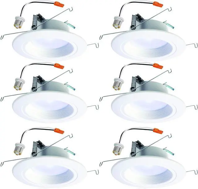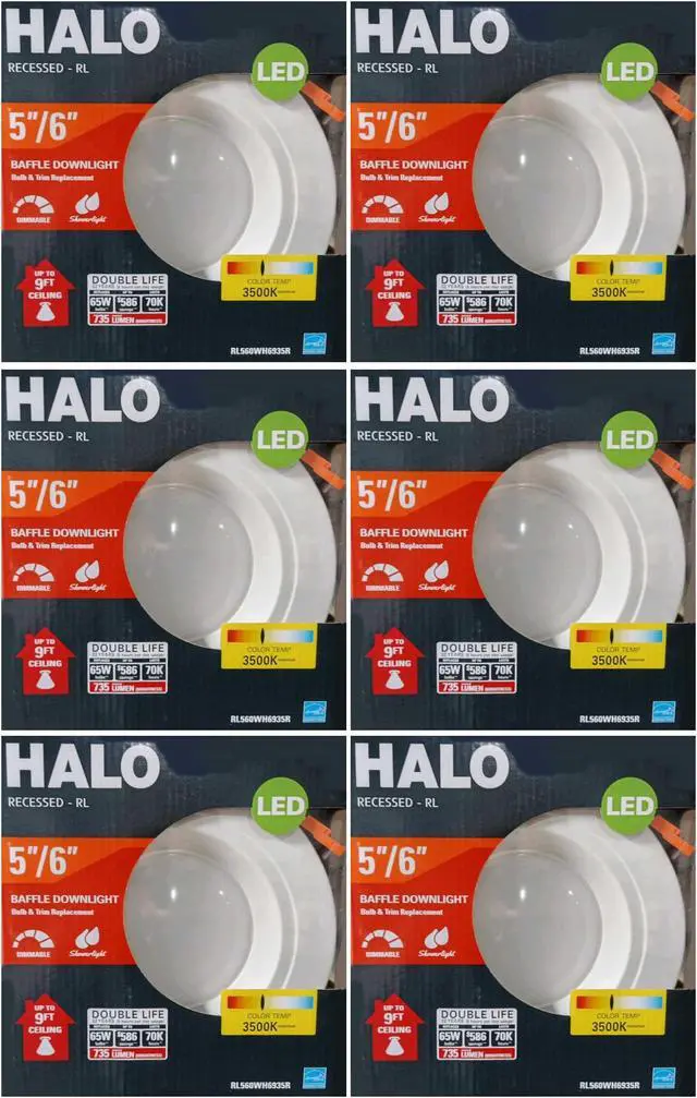 (6 pack) HALO Recessed RL560WH6935R 5" or 6" Integrated LED bulb with Recessed White Trim, 3500K Soft White, 735 Lumens, Dimmable, Very Wide Flood, Wet rated for shower use