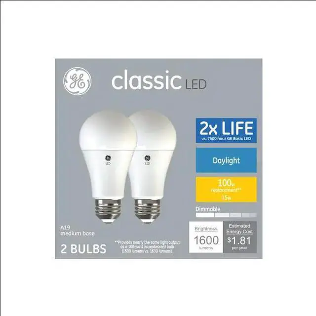 GE refresh HD Daylight LED 100-Watt Replacement A19 KEY_TAB light bulbs provide enhanced color contrast and boldness versus KEY_TAB standard LED bulbs. The high definition daylight light helps create an KEY_TAB energetic light that?s ideal for active spaces like playrooms, home offices, laundry rooms, basements and garages. They?re dimmable and KEY_TAB illuminate your home with a cool, bluish-white light. These are great KEY_TAB for frequently used fixtures?GE Refresh HD Daylight LED bulbs are rated KEY_TAB to last twice as long as GE Basic LED bulbs and save 136 dollars in KEY_TAB energy costs over the bulb's life versus a 100-Watt incandescent bulb. KEY_TAB Unlike CFL bulbs, GE LED HD bulbs feature enhanced color, instant full KEY_TAB brightness and are free of Mercury. Replace CFL and incandescent light KEY_TAB bulbs with GE Refresh HD Daylight LED general purpose light bulbs in KEY_TAB indoor table lamps, sconces and open fixtures, including damp locations.