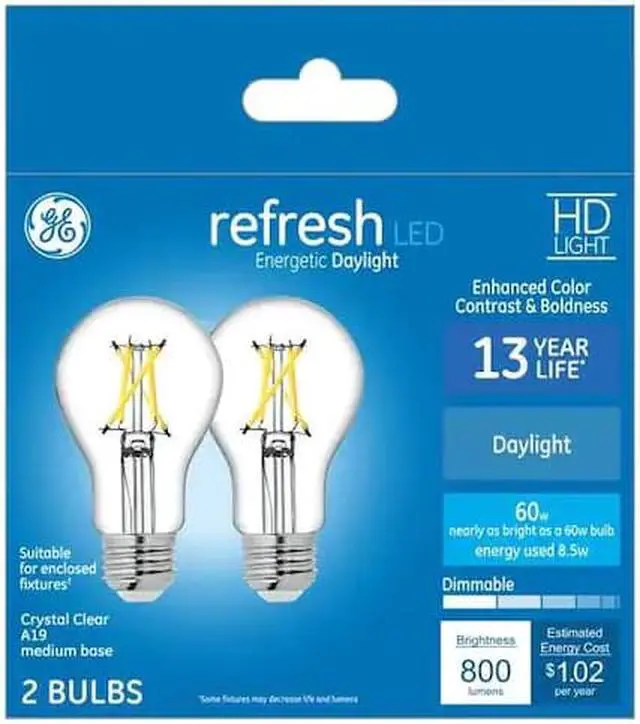 GE KEY_TAB Refresh HD Daylight LED 60-Watt Replacement A19 light bulbs provide KEY_TAB enhanced color contrast and boldness versus standard LED bulbs. The high KEY_TAB definition daylight light helps create an energetic light that?s ideal KEY_TAB for active spaces like playrooms, home offices, laundry rooms, basements KEY_TAB and garages. They?re dimmable and illuminate your home with a cool, KEY_TAB bluish-white light. These are great for frequently used fixtures?GE KEY_TAB Refresh HD Daylight LED bulbs are rated to last twice as long as GE KEY_TAB Basic LED bulbs and cost just 1.32 dollars to operate each year based on KEY_TAB 3 hours use per day at 11 cents per kilowatt hour. Unlike CFL bulbs, GE KEY_TAB LED HD bulbs feature enhanced color, instant full brightness and are KEY_TAB free of Mercury. Replace CFL and incandescent light bulbs with GE KEY_TAB Refresh HD Daylight LED general purpose light bulbs in indoor table KEY_TAB lamps, sconces and open fixtures, including damp locations.