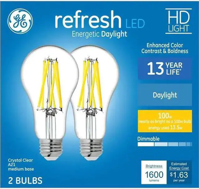 GE Refresh HD Daylight LED 100-Watt Replacement A21 KEY_TAB Crystal Clear light bulbs provide enhanced color contrast and boldness KEY_TAB versus standard LED bulbs. The high definition daylight light helps KEY_TAB create an energetic light that?s ideal for active spaces like playrooms, KEY_TAB home offices, laundry rooms, basements and garages. They?re dimmable KEY_TAB and illuminate your home with a cool, bluish-white light. These are KEY_TAB great for frequently used fixtures?this GE Refresh HD Daylight LED bulb KEY_TAB is rated to last 13 years and cost just 1.63 to operate each year based KEY_TAB on 3 hours use per day at 0.11 per kilowatt hour. Unlike CFL bulbs, GE KEY_TAB LED HD bulbs feature enhanced color, instant full brightness and are KEY_TAB free of Mercury. Replace CFL and incandescent light bulbs with GE KEY_TAB Refresh HD Daylight LED general purpose light bulbs in indoor table KEY_TAB lamps, sconces and open fixtures, including damp locations.