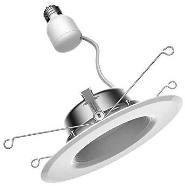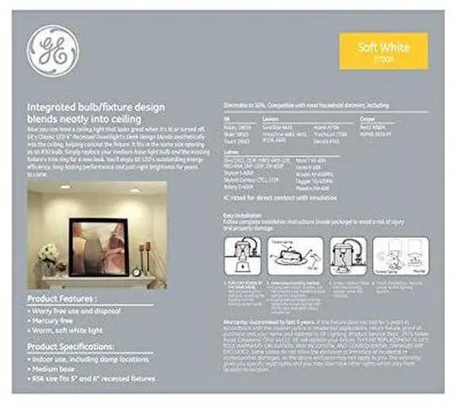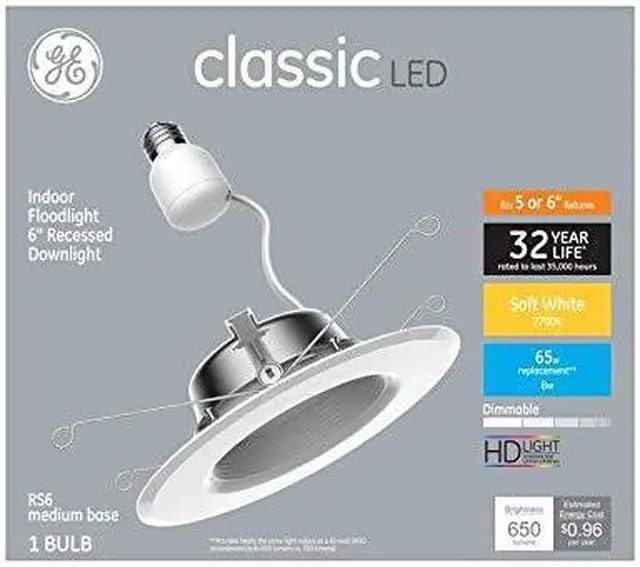 Unlike CFL bulbs, GE LED bulbs feature instant full brightness and are free of mercury. Replace CFL, halogen and incandescent R30 light bulbs with GE classic soft white LED 6 In. diameter recessed downright indoor floodlight bulbs in indoor recessed lighting fixtures, including damp locations. 65 Watt replacement using only 8 Watts (650 lumens) Rated to last 32 years based on 3 hours per day use Saves 219 dollars on energy costs per bulb vs. 65-Watt R30 incandescent over the bulb's life Dimmable and works with most dimmer switches Warm, soft white high definition light/2700 kelvin color temperature 1 LED recessed downright fixture per package RS6 (6-inch diameter)/white plastic trim Medium base (E26) Indoor floodlight recessed downright for 5 In.