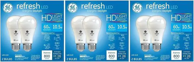 (6 bulbs) GE Refresh LED A19 Light bulb, pack of 2 bulbs, 10.5 watts, 800 lumens, 5000K Daylight, Dimmable