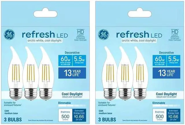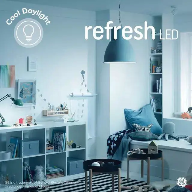 The GE Refresh HD Cool Daylight Bulbs are improved, energy-saving LED KEY_TAB bulbs that enhance home dcor and the appearance of colors. Experience KEY_TAB the difference with bolder colors and enhanced contrast vs standard LED KEY_TAB white light bulbs. Dim the lights and set the KEY_TAB right mood for any occasion with these dimmable light bulbs. Our KEY_TAB high-definition light bulbs offer a cool, invigorating light that is KEY_TAB perfect for energizing moments and active spaces. We recommend these HD KEY_TAB bulbs for use in spaces like bedrooms, family rooms, dining rooms, and KEY_TAB entryways. These energy-efficient daylight bulbs are beautiful and will illuminate your room and inspire you to smile.