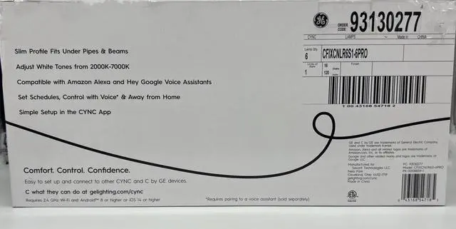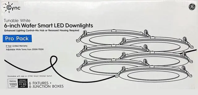 (6 LED wafer lights) GE Cync 6 inch Wafer Pro Pack Smart LED Downlight, Tunable White, adjustable from 2000K to 7000K, 6 fixtures plus 6 junction boxes, 1000 lumens, 16 watts, KEY_TAB Dimmable with app or Cync Smart Dimmer Switch