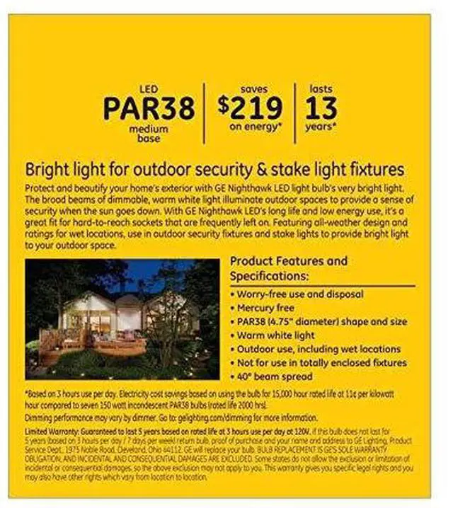 of GE Nighthawk LED PAR38 (4-3 with 4-inch diameter) Floodlight bulbs.