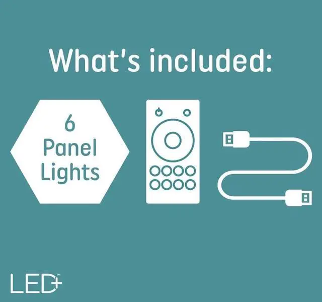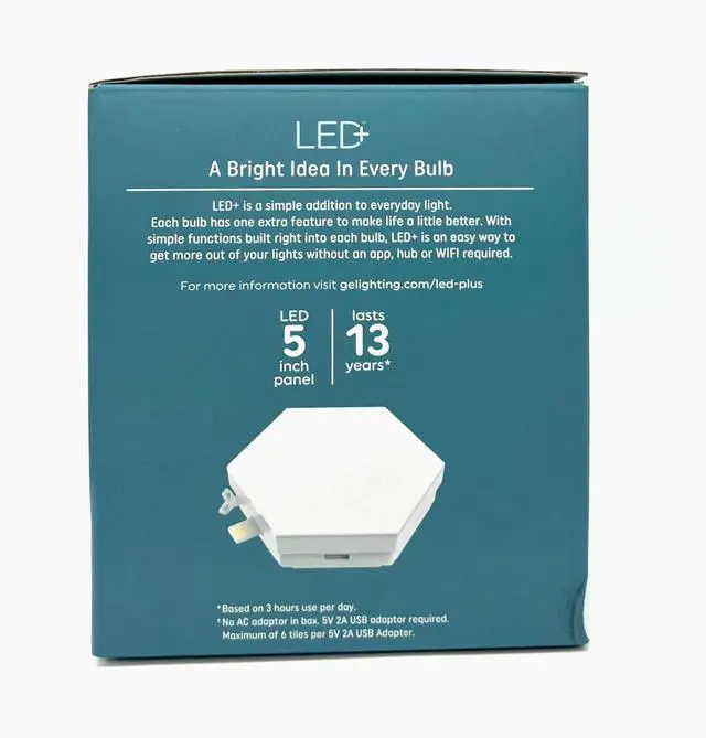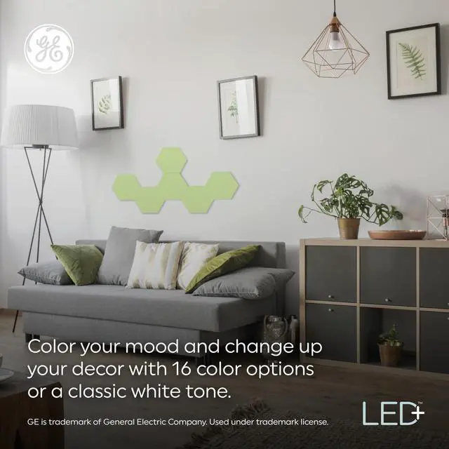 Elevate your space with the cutting-edge GE LED+ Color Changing LED Light Tiles with remote ? an inspiring lighting solution that effortlessly sets the mood. With a spectrum of 16 different colors + white light at your fingertips, unleash your creativity and design a truly unique atmosphere that reflects your personality and mood with state-of-the-art hexagon panel lights. Whether you're hosting a party, enjoying a cozy movie night, or seeking a relaxing retreat, these mood lights empower you to curate the ideal ambiance suitable for any occasion. Perfect for kids' rooms, playrooms, dorm rooms, seasonal dcor or gift giving - these colored lights bring a touch of magic and inspiration to your world. Setup is a breeze ? simply link the wall decor tiles in your desired shape, mount them to the wall or surface using included fasteners and adhesive. Use the included remote control to adjust colors, brightness, and 5 light modes - no app, hub, or WiFi required. Crafted with high-quality materials and energy-efficient LED technology, our color changing decorative wall lights add a touch of elegance to your space but also help save on energy costs. It?s LED light plus an uncomplicated colorful solution. WARNING: This product contains a lithium button/coin cell battery. Keep coin cell batteries out of reach of children.