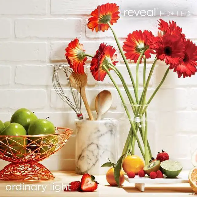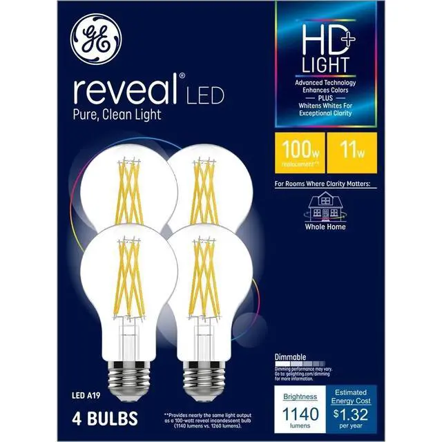 GE reveal LED A19, 100 watt equivalent, 11 watts 1140 lumens, HD Light, Dimmable, medium base, pure, clean reveal HD light (4 bulbs). KEY_TAB Reveal HD Light (GE's most advanced light technology-- enhances colors, whitens whites for exceptional clarity)