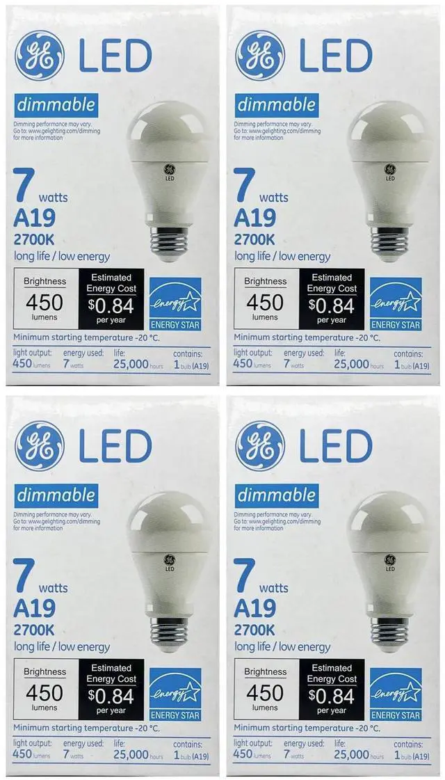 (case of 4 bulbs) GE 11332 - LED7DA19/827 LED A19, 450 lumens, 7 watts, 2700K warm white, dimmable, E26 base