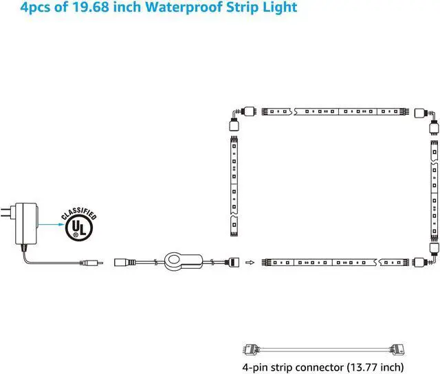 3 methods to control the light kit offer an intelligent lifestyle and make the light bars really easy to operate for people of all ages. Easy and Flexible Install This slim LED lighting kit is perfect for corner application and hiding behind doors or under counters. Each light bar has 3M tapes backing on both sides and also can be fixed by screws (included). End-to-end bi-pin connector allows you to extend to different lengths to suit your needs and requirements. Personal Theater The multi-color TV strip lights will bring a soft and romantic illumination effect to your TV, desktop, computer or other display screens and provide a professional studio look.