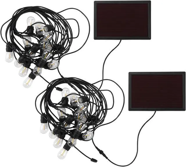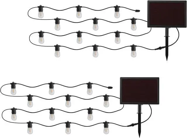 These LED String Lights provide decorative lighting without the constraints and costs of traditional lights. Turns on automatically in darkness and will turn off once exposed to sunlight. The Amorphous solar panel converts the suns energy and the lights can run up to 12 hours after a full charge. 30 Ft strong and waterproof wire with 12 replaceable bulbs per strand for a total of 60 ft and 24 lbs. Rated IPX5 which make them great for outdoors. (2 sets per order)