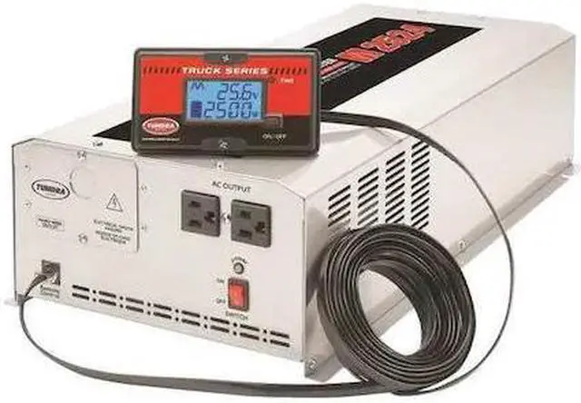 Inverter, Features High Capacity, Ultra-High Output Efficiency and Continuous Output Capacity, Output Form Modified Sine Wave, DC Connection Terminal Blocks, Continuous Output Power 2, 500 W, Peak Output Power 5, 000 W, Number of Outlets 3, Input Voltage 24V DC, Output Voltage 120V AC, Output Frequency 60 Hz, Efficiency 93 Percent, Overall Depth 24 3/8 in, Overall Height 5 1/8 in, Overall Width 10 3/8 in, Outlet Type (2) NEMA 5-15R, Hardwired, Case Material Steel, Includes LCD Remote Control.