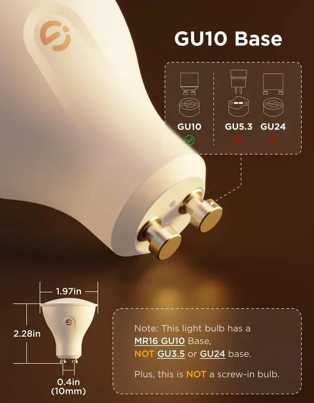 • Note: These light bulbs have a GU10 base, NOT GU3.5 or GU24 base. Plus, this is NOT a screw in light bulb.The product is 2.28 inches high and 1.97 inches wide. Please check if the bulb model is compatible with your light fixture.