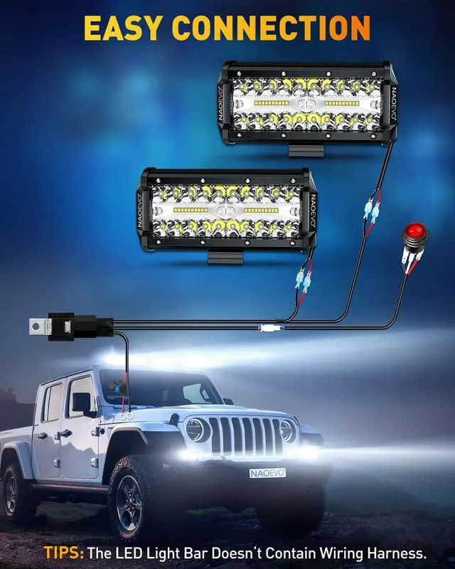 | TIPS | The Light Bar Kit Doesn't Contain Wiring Harness. We recommend the official NAOEVO wire harness, search "B0B44RW3CY" or "B0B44XN2HJ" (2 Leads, single mode) on to purchase. |
