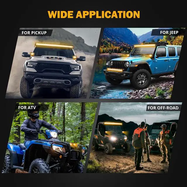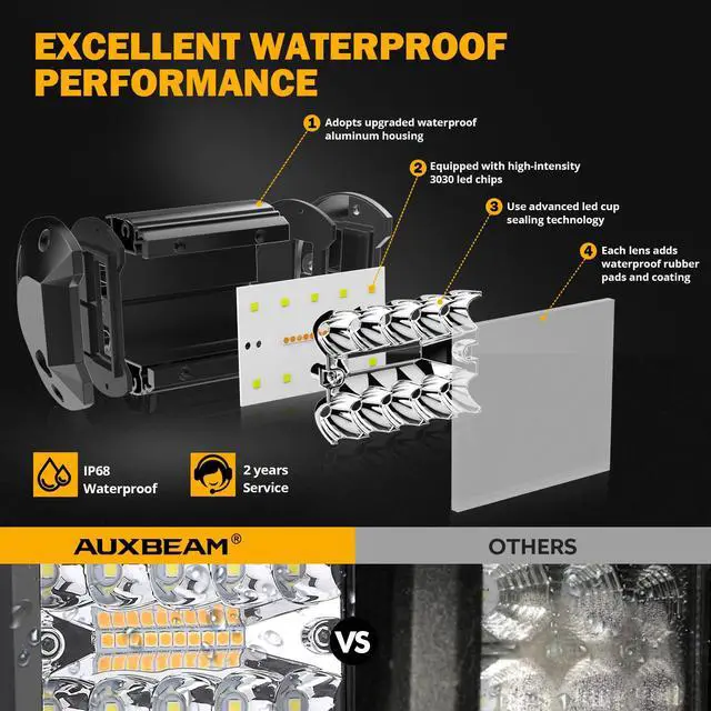 White Lighting, Amber Lighting, White & Amber Lighting, Strobe White Lighting, Strobe Amber Lighting, White & Amber Strobe Lighting. Auxbeam 4 inch amber strobe lights are very suitable to be used as off road lights, ditch lights, fog lights, driving lights, backup lights, warning lights, work lights.