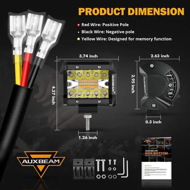 - —— A: Auxbeam amber offroad lights is a three-wire design. When connecting, please connect the black wire to the negative pole, the red & yellow wires to the positive pole. (The function of the yellow line is to change the lighting mode)