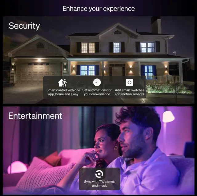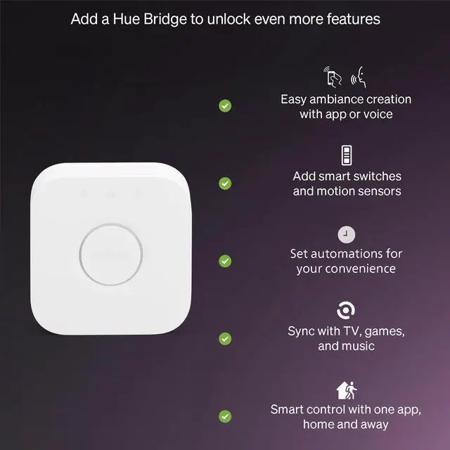 EXPAND YOUR SETUP: Add a Hue Bridge and other Hue products to unlock more features, including home security and content syncing with music, movies, and video games.