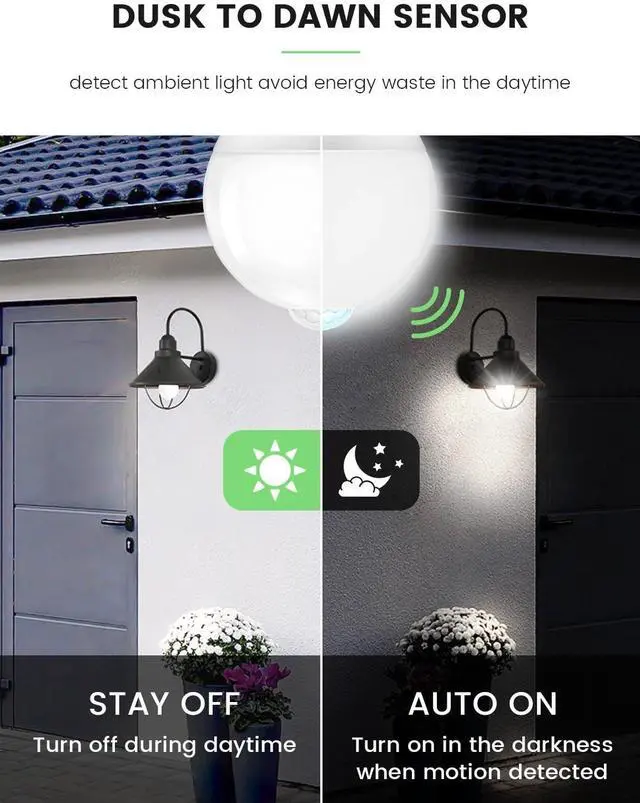 | Additional Features | Auto on/off e26 bulb, Dusk to dawn sensor, Motion Sensor, Super bright |