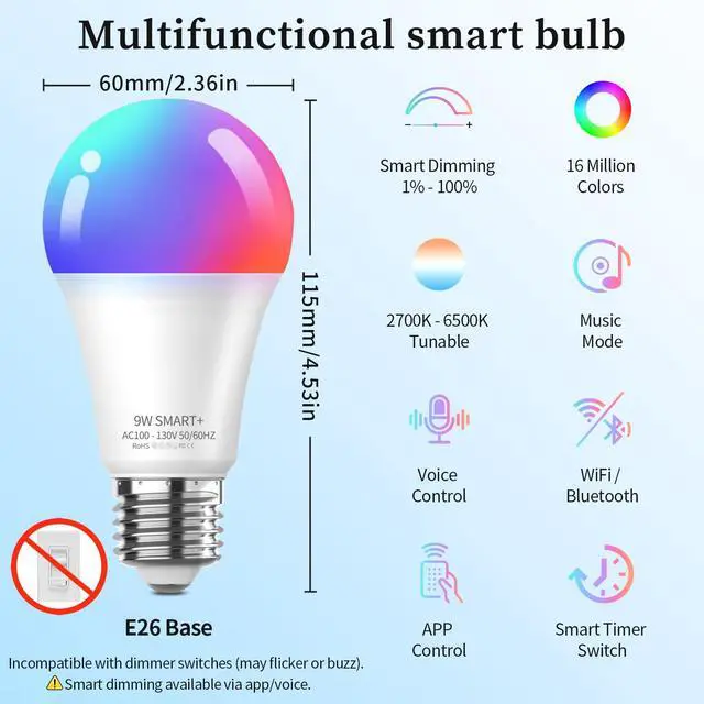 16 Million Colors & Tunable White -- Transform your room with 16 million vibrant color and 44 preset scene, enjoy full spectrum RGB colors and adjustable white tones from warm 2700K to cool 6500K. Perfect for setting the perfect ambiance for any activity from cozy relaxation to vibrant parties. (Note: This A19 smart bulb cannot be used with smart switches)