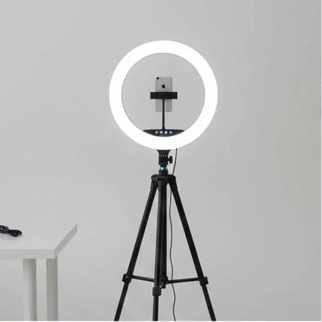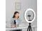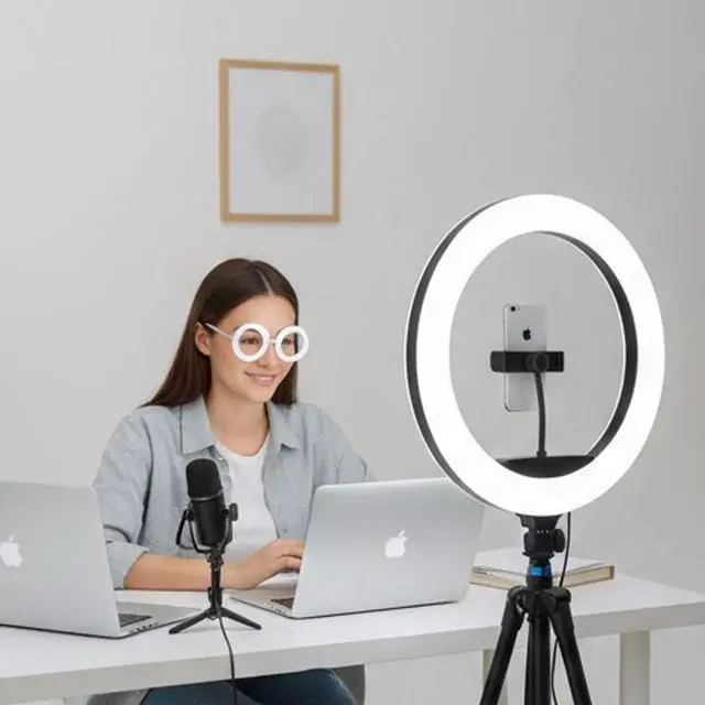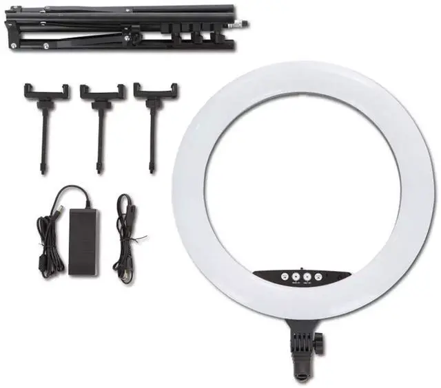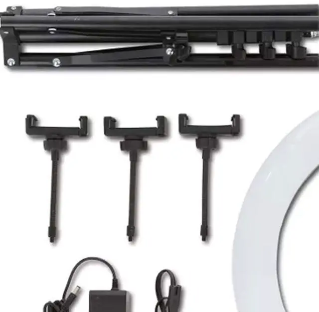 Enhance your photography and videography setup with this 18 inch LED ring light featuring RGB multicolor lighting. The adjustable tripod stand extends up to 63 inches, providing versatile angles for selfies, live streaming, makeup tutorials, or video calls. The wireless remote allows easy control of brightness and color modes, while the included phone holder ensures compatibility with most devices. USB powered for convenient charging and use anywhere, this portable ring light kit comes with a soft carry bag for easy transport. Perfect for content creators, social media enthusiasts, and anyone seeking professional-quality lighting.