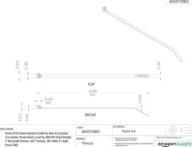Cable Tie, Standard, Actual Length 8 in, Width 0.18 in, Nominal Length 8 in, Locking Style Stainless Steel Barb, Color Natural, Basic Material - Cable Tie Nylon, Tensile Strength 50 lb, Halogen-Free, Low-Smoke, Plenum Rated, Standard, Nominal Max. Bundle Dia. 2 in, Temp. Range -76 Degrees to 185 Degrees F, Number of Straps 1, Flame Retardant No, Metal Detectable No, Outdoor Use No, Plenum Rated Yes, UL Type 2, Thickness 0.05 in, Max. Bundle Dia.