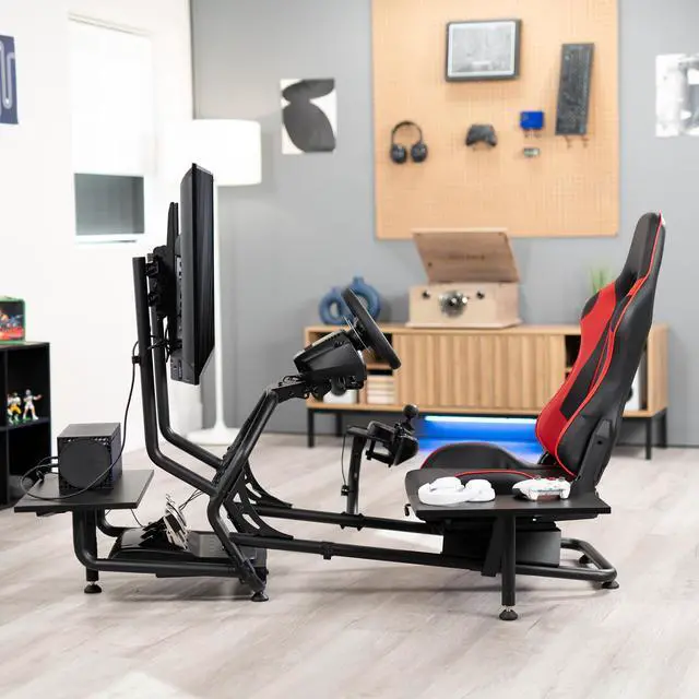 Give your gaming setup a whole new feel with the Racing Simulator Cockpit with TV Mount & Shelf Kit (STAND-KIT-RACE1BS) from VIVO! Spend your time on the racetrack in comfort with this seat designed for lumbar support and comfortable tilting angles. The solid steel frame is built for scratch resistance, security, and long-lasting use to accompany your gaming adventures for years to come. The adjustable design provides tilting capability on the wheel stand, TV mount, and chair, including forward and backward movement on the reclining seat. The single TV bracket anchors to the cockpit, making a solid mounting point for screens up to 50 in size. Add storage capability with a front-mounted PC shelf and left-side-mounted keyboard and mouse shelf that hold your gaming accessories off of the floor in an easy-to-reach location. All hardware and instructions are provided for assembly, so you can get your new simulator cockpit, TV mount, and shelves put together in no time!