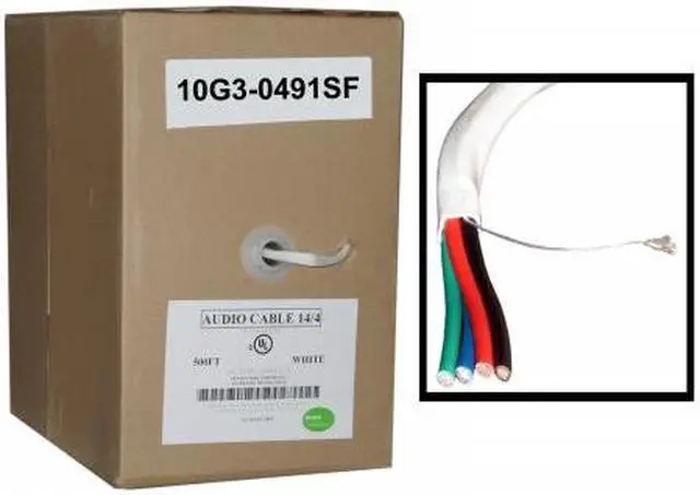 Speaker Cable, White, Pure Copper, CM / Inwall rated, 14/4 (14 AWG 4 Conductor), 105 Strand / 0.16mm, Pullbox, 500 foot