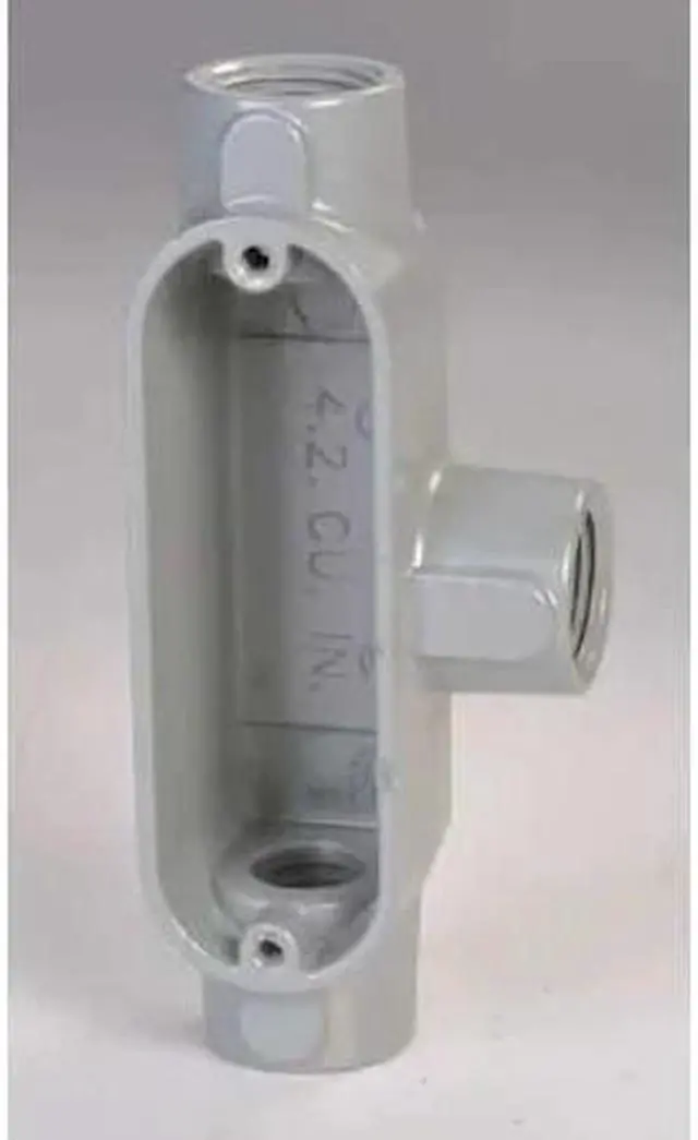 Conduit Outlet Body, Overall Width 1 1/8 in, Overall Height 1 3/8 in, Overall Length 4 3/4 in, Trade Size 1/2 in, Compatible Conduit Trade Size 1/2 in, Hub Size 1/2 in, Compatible Cover K50-A, K50-CA, Aluminum, Compatible Conduit Type EMT, Back Type Flat, Body Capacity 4 cu in, Body Style T, Body Type Conduit Outlet Body, Color Gray, Connection Orientation Multi-Angle, Connection Type Set Screw, Finish Powder Coated, For Use With EMT, Hazardous Location Yes. This item has been restricted from sale in the following state (s): []