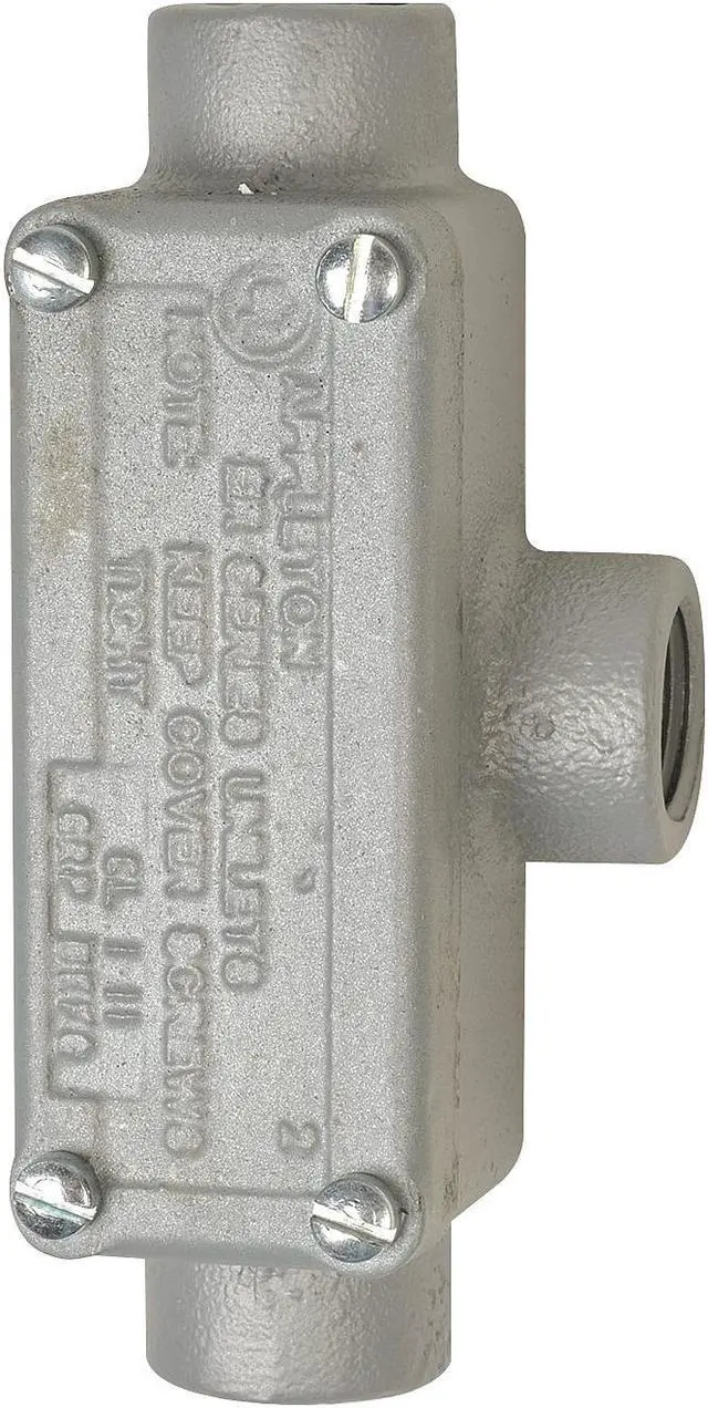 Conduit Outlet Body, Trade Size 1/2 in, Compatible Conduit Trade Size 1/2 in, Hub Size 1/2 in, Compatible Cover Not Applicable, Iron, Compatible Conduit Type RMC, Indoor/Outdoor Usage Indoor/Outdoor, Back Type Flat, Body Capacity 4.8 cu in, Body Style T, Body Type Conduit Outlet Body with Cover, Color Gray, Connection Orientation Multi-Angle, Connection Type Threaded, Cover Included Yes, Finish Triple Coat Epoxy Coating, For Use With RMC, Hazardous Location Yes. This item has been restricted from sale in the following state (s): []