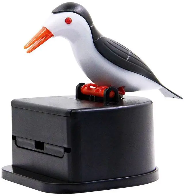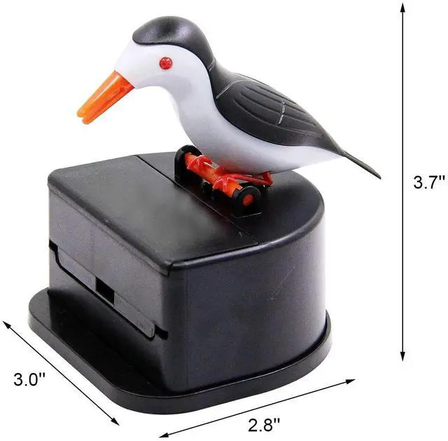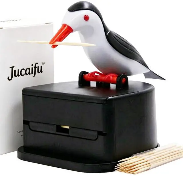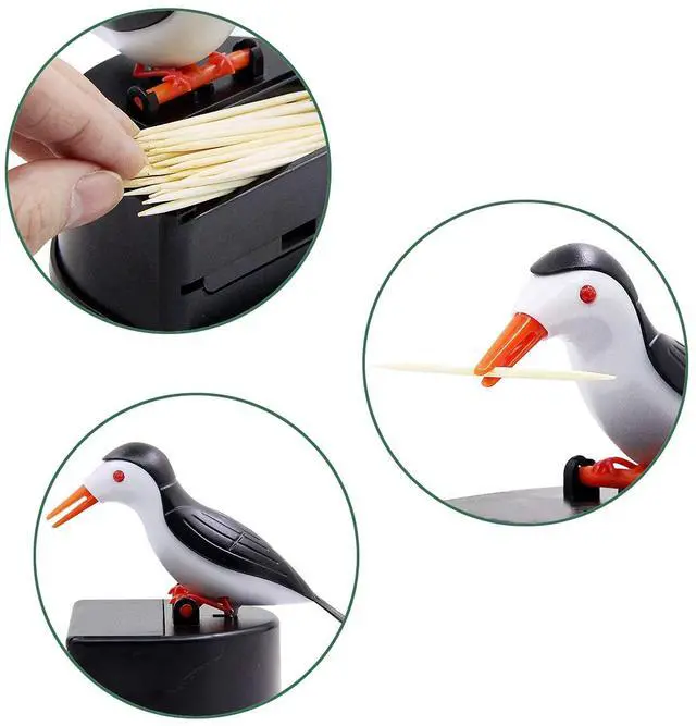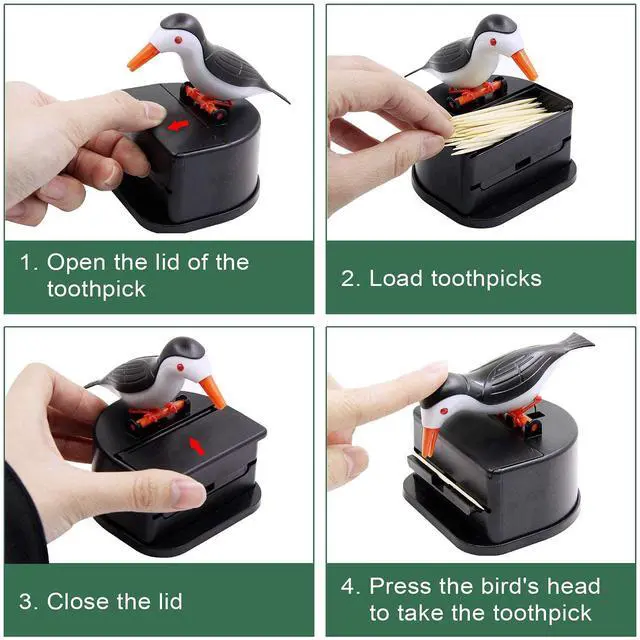This interesting design will make your eyes shine. Press the bird's head and he will pick up the toothpick for you. This design toothpick dispenser can avoid multiple contact with the toothpick , and it is easy to operate with one hand.