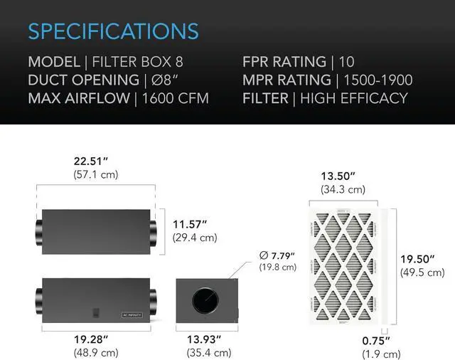 Includes a standard high efficacy filter that traps particles like dust, dirt, lint, and odor. 22.51 x 11.57 x 13.93 / Fits 8 Inline Fans / 1600 CFM Maximum / Accepts 14 x 20 x 1 Filters