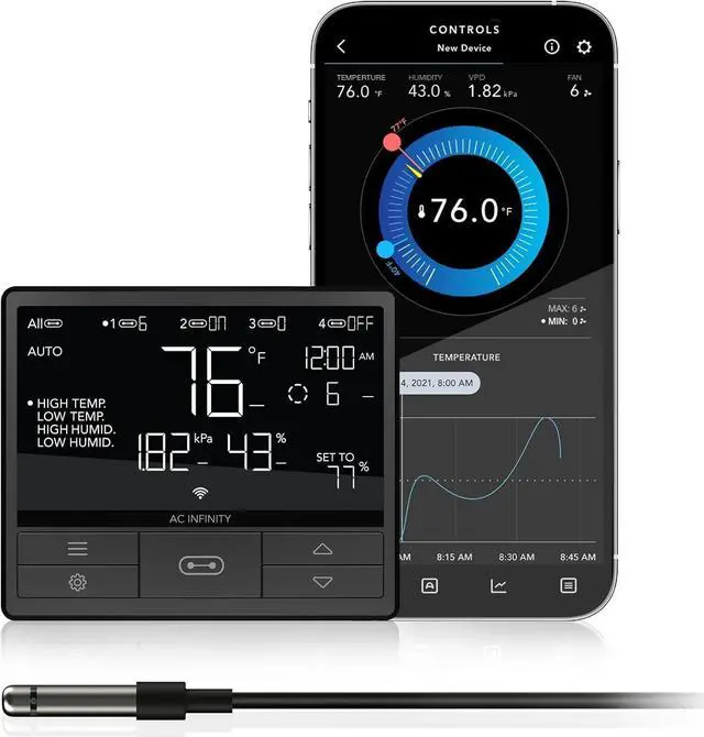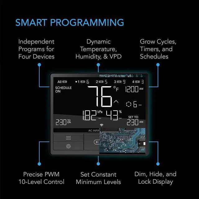 A digital controller designed to equip AC Infinity devices with smart controls to produce the optimal environment.Control up to four devices from fans to grow lights and provide each with their own independent programming.Automate devices to dynamically change speed and brightness levels in response to temperature, humidity, and VPD.