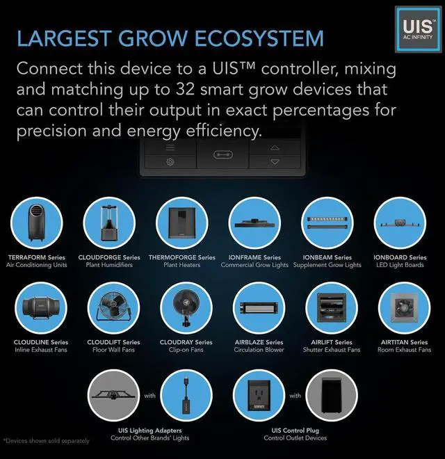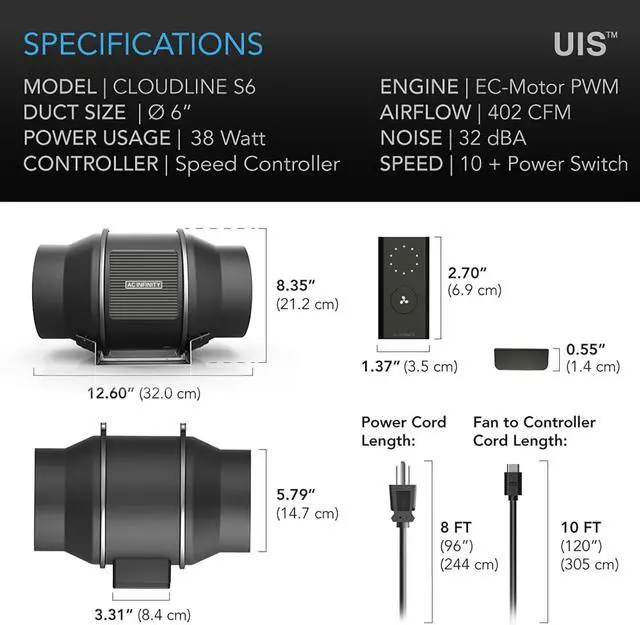 Designed to ventilate grow tents, transfer heating/cooling to rooms, circulate air, exhaust odors, and cool AV racks.Features a wired 10-speed fan controller; also compatible with all UIS controllers with intelligent programming.PWM-controlled EC motor provides quiet and energy-efficient performance with minimal heat and noise.