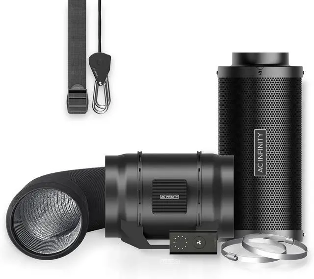 • An air filtration kit with everything you need to cool, ventilate, and control odors in your grow space.Features the CLOUDLINE inline fan with speed controller, delivering silent and efficient performance.Carbon filter with prefilter cloth uses 1200+ IAV activated charcoal for high efficacy odor blocking.