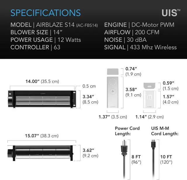 AIRBLAZE S14, Universal Fireplace Blower Fan Kit 14 with Wireless 10-Speed Controller, Compatible with Lennox, Hearth Glo, Majestic, Rotom Fireplaces, for Home Heat Circulation